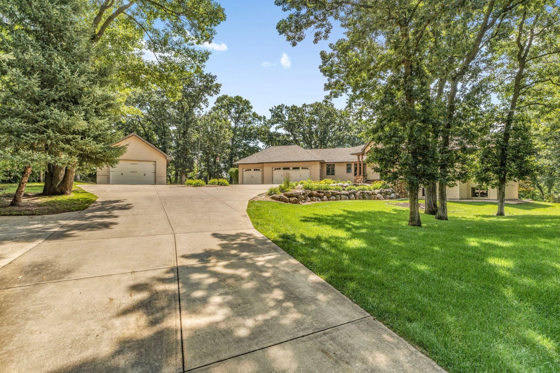 Tuscan-Inspired Walkout Rambler on 5.54 Private Acres with Resort-Style Amenities. Welcome to your private retreat - where timeless Tuscany design meets modern luxury. This stunning walkout rambler boasts over 5,000 finished square feet of elegant living space, thoughtfully designed for comfort, entertaining, and relaxation. Step into the expansive great room with panoramic views of the in-ground pool and private acreage, creating a seamless indoor-outdoor experience. The private primary suite offers a serene escape with spa-like amenities, while three additional bedrooms provide ample space for family or guests. Enjoy the ultimate in leisure with your own sauna, spa, and resort-style pool, all set against the backdrop of 5.54 secluded acres. Car enthusiasts and hobbyists will love the multiple garage options - a 3-stall attached garage, a 3-stall tuck-under garage, and a large 24' x 40' detached garage for all your toys and tools. Whether you're hosting summer pool parties or enjoying quiet evenings under the stars, this home offers a rare blend of luxury, privacy, and functionality.